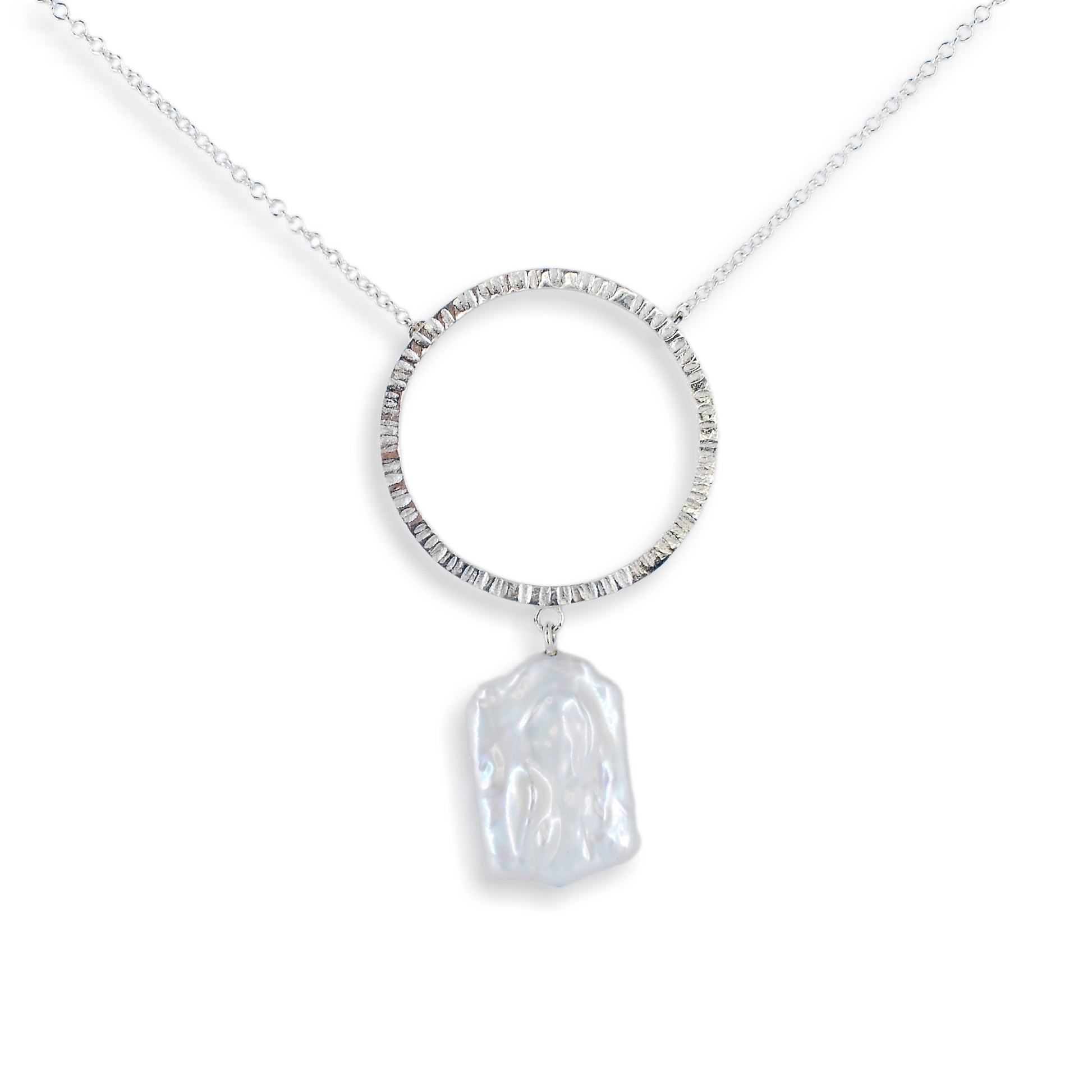 Beautifully handmade silver pendant with a white freshwater baroque pearl dropper and a satin textured finish.