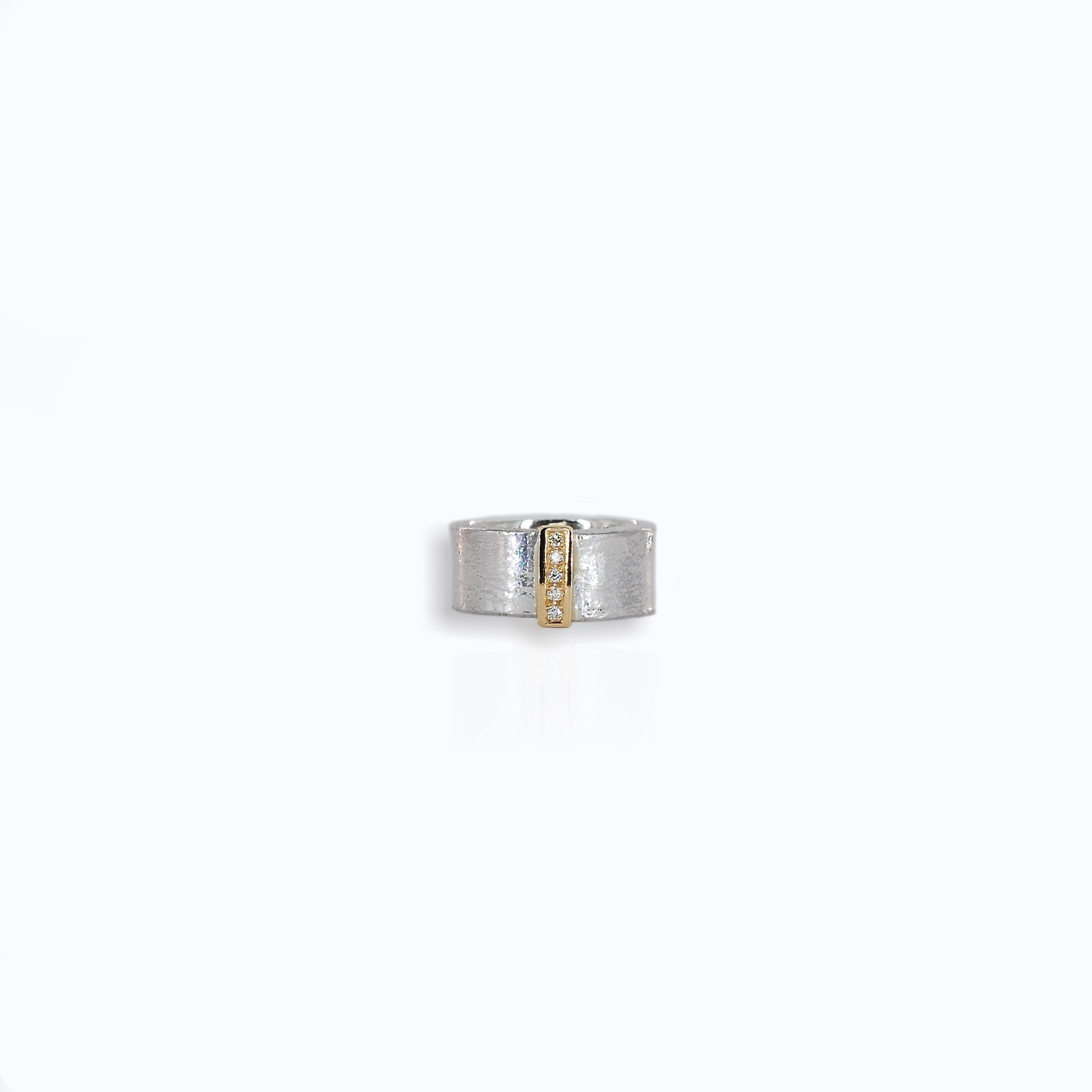 A simple yet stylish and modern diamond textured silver ring with polished 9ct yellow gold set with 5 brilliant cut round diamond.